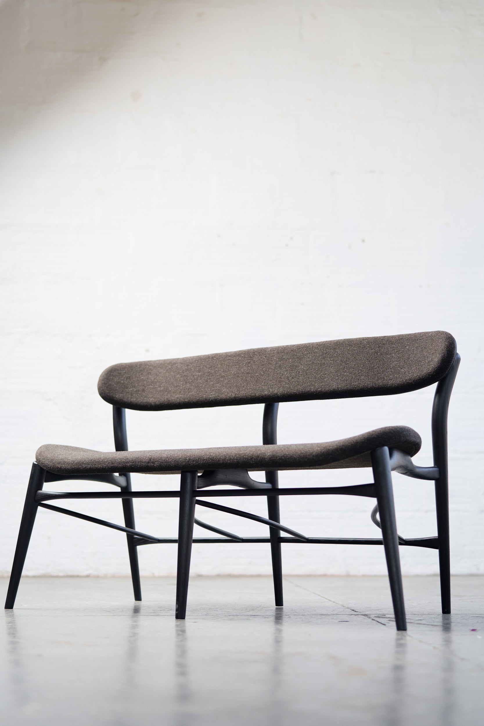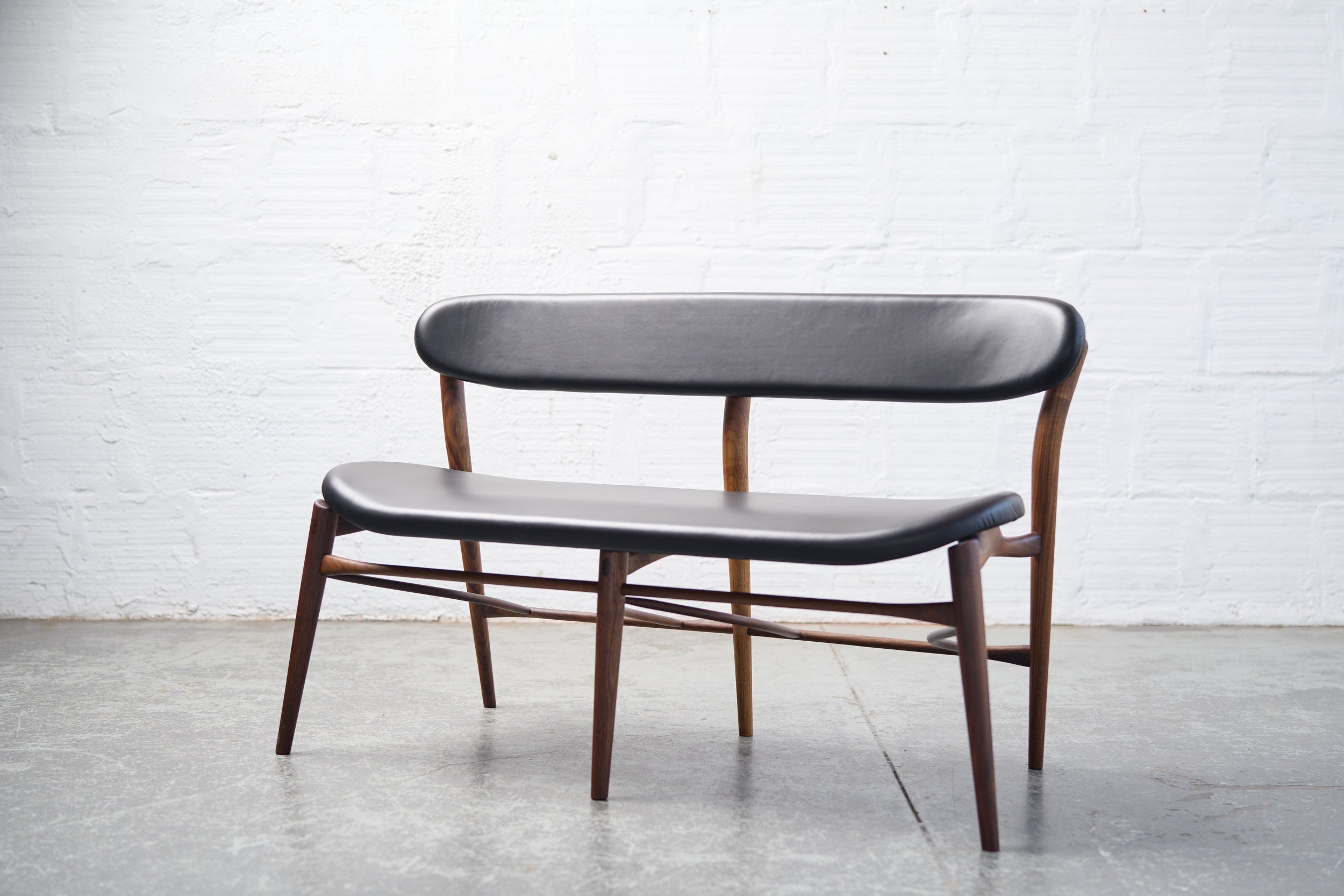 This is our first upholstered piece, and I was determined to develop ways to make the surface of the seat feel comfortable while looking elegant. Each seat is quite sturdy, formed on a vacuum press in our shop and consisting of 6 layers of material, being further strengthened by the shape of the compound curve. After this process, we add foam and upholstery. The undersides are also upholstered, and they clam-shell into the upper section seamlessly. There is a pocket stitched on to the bottom of each seat containing a key for any future re-upholstery disassembly… see more below.