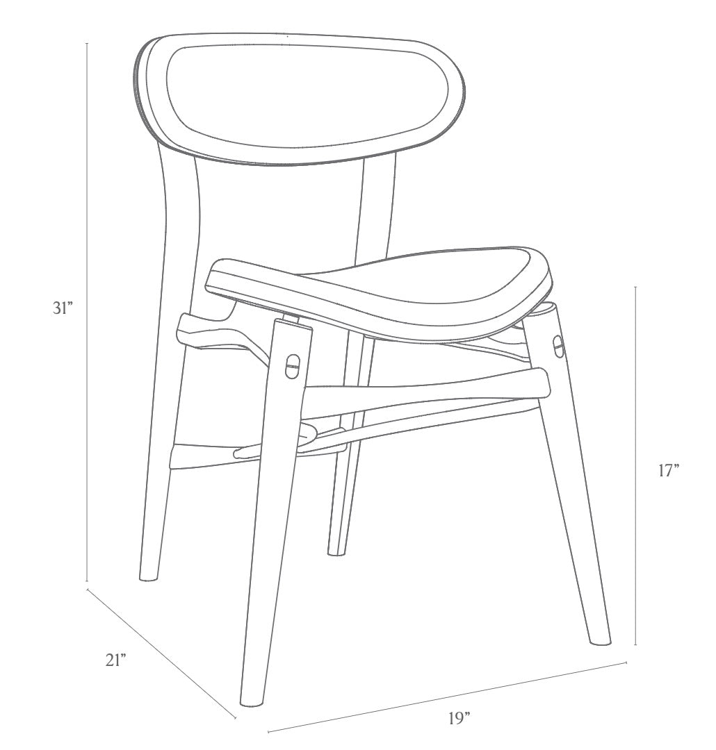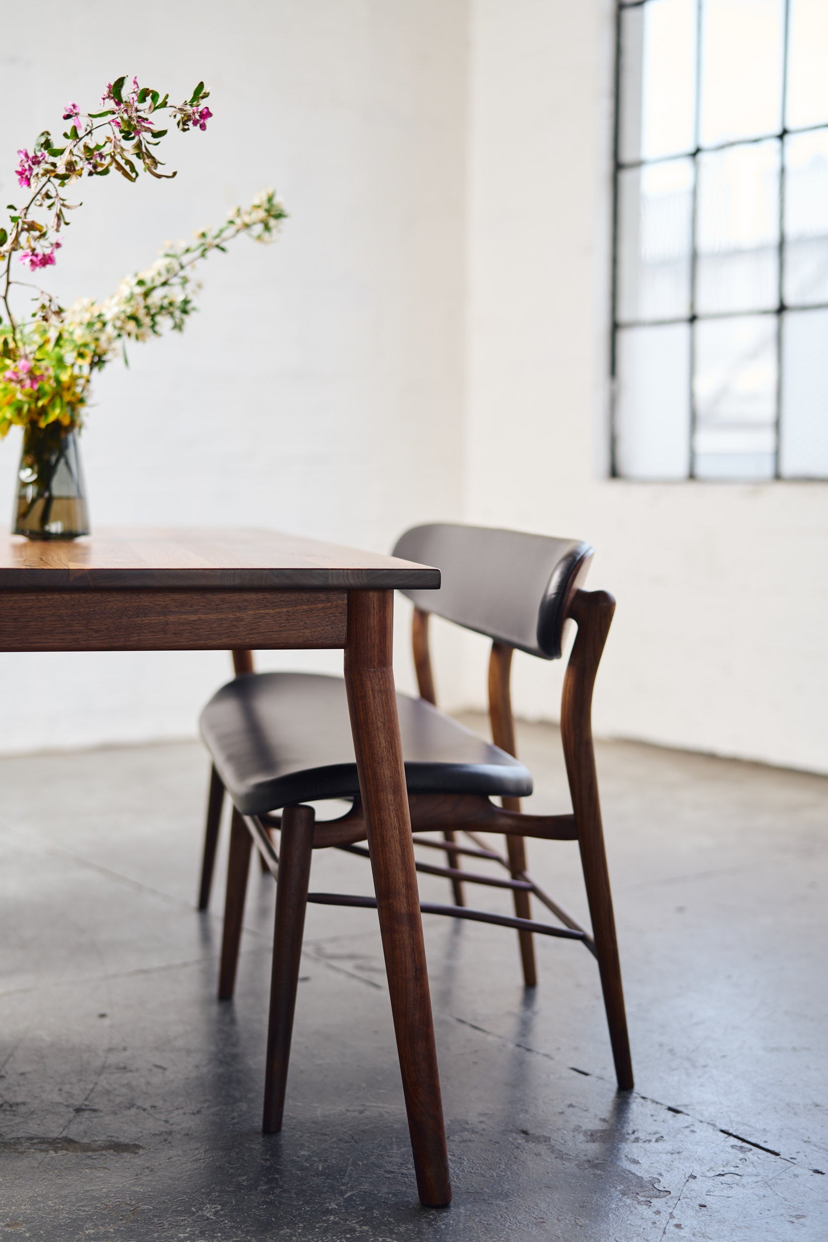 The fjoon occasional/dining chair features a vacuum-laminated upholstered seat with a sweeping compound curve, stepped mortise-and-tenon joinery with a friction wedge, and a patented wood plug system which allows for re-upholstery down the line without having to destroy / re-fabricate any chair parts. We meticulously selected ten offerings of upholstery leathers and textiles of the highest quality from our newest partners Sorensøn and Kvadrat.