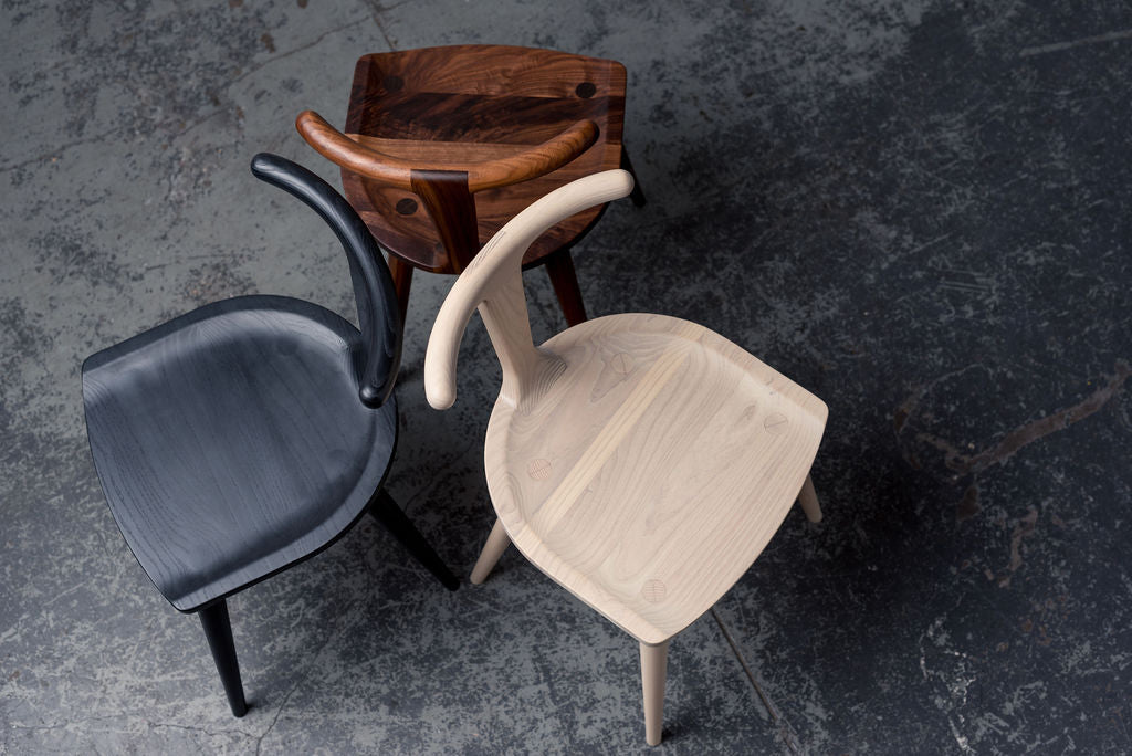 After a couple years of production of our original collection, Justin began dreaming about the next step. We needed to offer some dining / occasional seating, and an idea began percolating for an austere, minimalist chair that could include more classic wood joinery techniques than did our original collection.