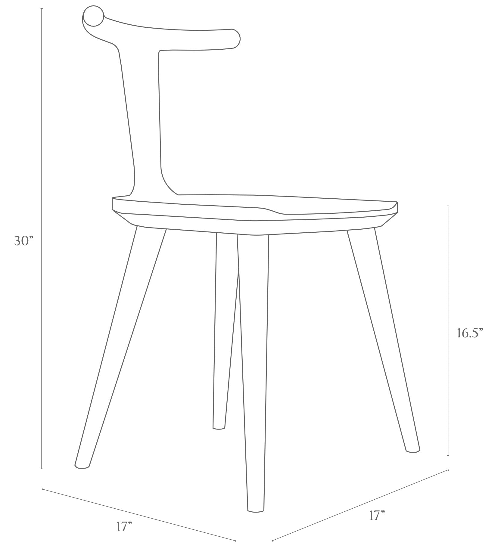 Total Dimensions: Seat: 17” wide x 17” deep x 16.5” high at front. Backrest: 29.5” high at center, 30” high on ends